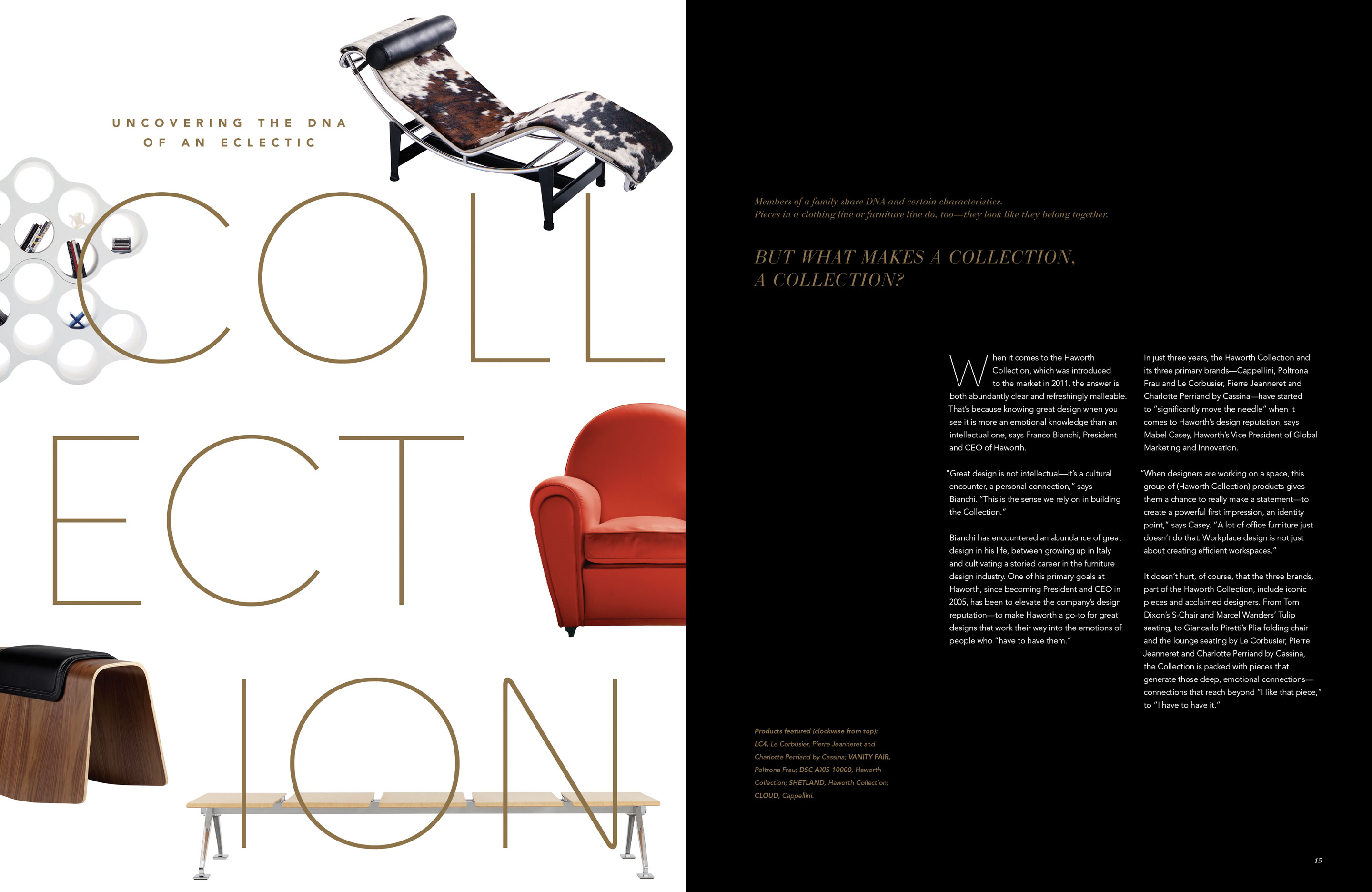 Editorial design for Icon, a publication showcasing the Haworth Collection brands.